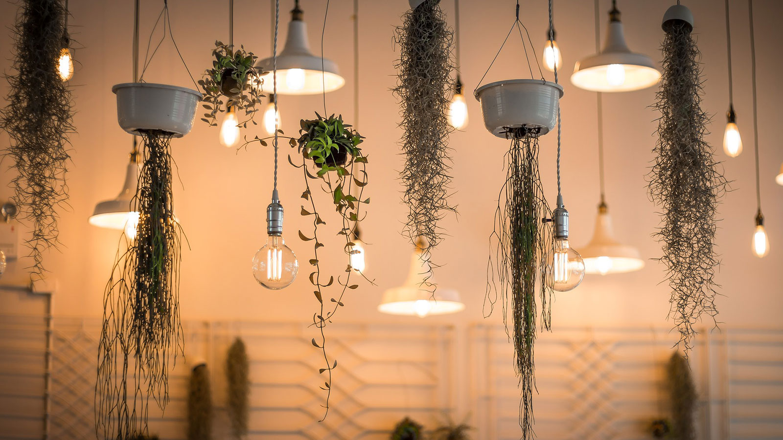 店内にはいろいろなインテリアがあります。テーブル、椅子、ライト、観葉植物 etc… 天井が高いので、仰ぎ見ないと気づかないものもあるかもしれません。